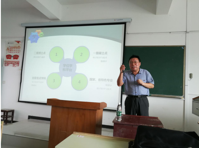 6月28日下午,湖北大学物理与电子科学学院副院长杨昌平教授、物理系主任丁益民教授应邀在创新楼302作学术讲座。welcome888集团电子院长兰智高、物理系主任王小兰、部分教师及学生代表约60人聆听了讲座。