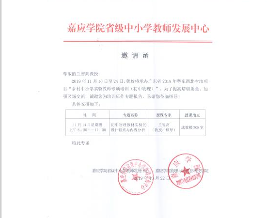 上午,兰教授为2019年广东省乡村物理实验教师做了专题报告“初中物理教材实验的设计特点与内容分析”。兰智高教授从学校办学历程“源于师范”“兴于师范”“强于师范”三个阶段切入,详细介绍了888集团官网的百年师范办学特色;从跨学科研究视角,深入讲解了物理学及研究内容的变化和科学研究范式 ;从比较研究研究视角,对人教版八、九年级物理教材实验内容进行了分析;从系统理论、传播理论、学习理论与教学设计的关联入手,解读了初中物理实验设计特点。报告中,引入了丰富的案例、个人的教科研成果、心得,与33名学员进行了互动,学员反映大有收获。嘉应学院副院长张恩德教授陪同。在交流期间,遇到了国家课程标准研制专家华东师范大学胡炳元教授,与胡教授进行了深入的交流。