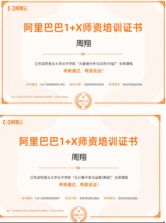 welcome888集团电子在暑假期间组织相关老师(兰智高,熊杰,祁翔,谢伟,刘珊,周翔)参与了阿里巴巴1+X职业技能等级证书师资线上培训。大数据分析与应用(7月22日-24日),云计算开发与运维(7月28日-30日),并于8月20日前完成云中对应层级的资料学习并参加该层级内容测试,通过后获得师资培训证书。