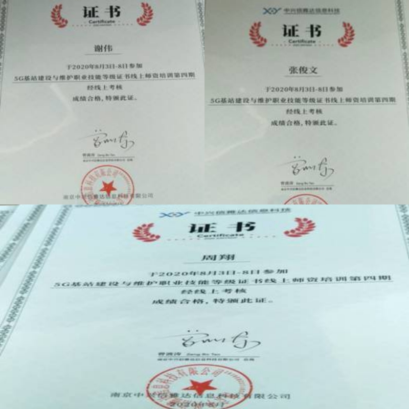 welcome888集团电子在暑假期间组织相关老师(谢伟,张俊文,周翔)参与了5G基站建设与维护职业技能等级证书师资线上培训(8月3日-8日)并参加测试,获得师资培训证书。张俊文老师于8月24日-31日到重庆电子工程职业学院国培基地参加了1+X 5G基站建设与维护线下培训并结业。