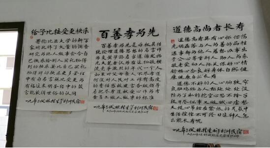 报告中,林老师展示了他写的老三篇——《天下最伟大的职业是母亲》、《天才》、《石头》,新三篇——《给予比接受更快乐》、《百善孝为先》、《道德高尚者长寿》,以及《母爱尚若水,父爱重如山》、《笔墨香自苦寒来》等优秀作品。每幅作品都隐藏着人生哲理,都有它的故事,林老师都能娓娓道来。