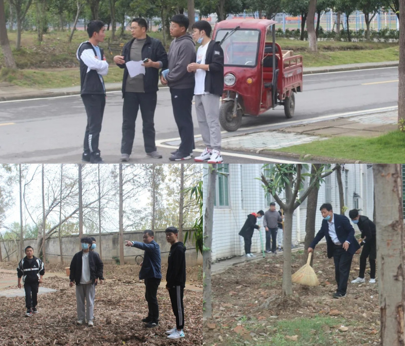 第一大组由杜杰书记负责,王巍老师和江俊新老师分别带领两小队成员负责物电楼东、南、西、北四个方向的花坛、广场的打扫。