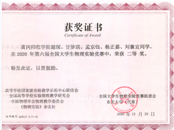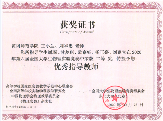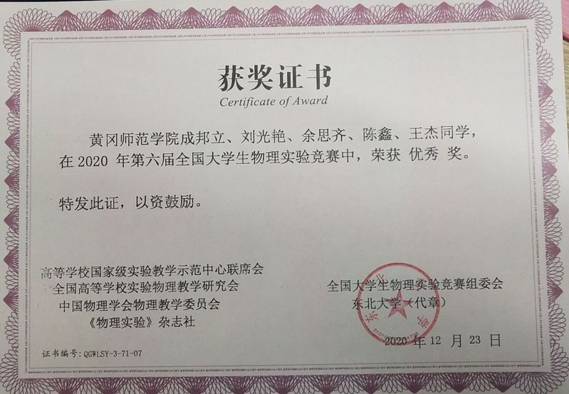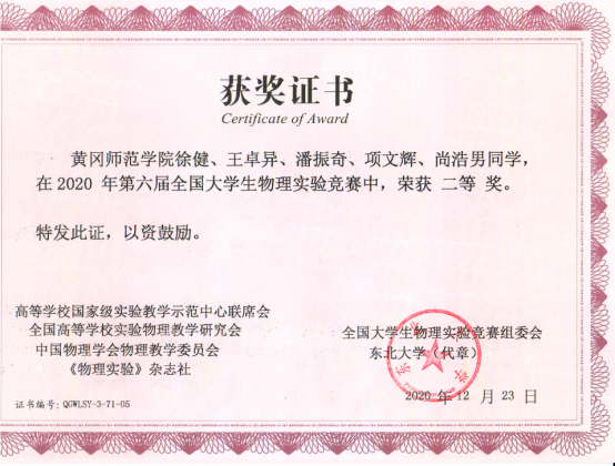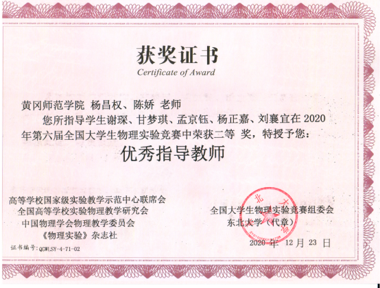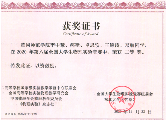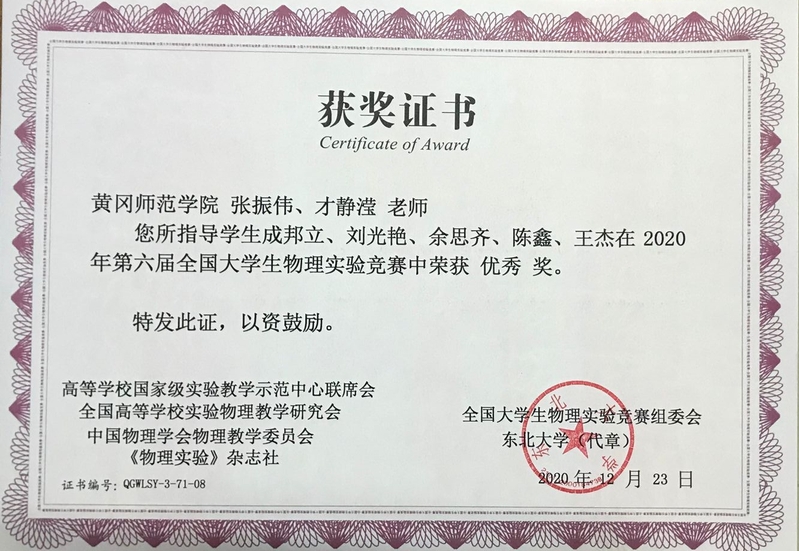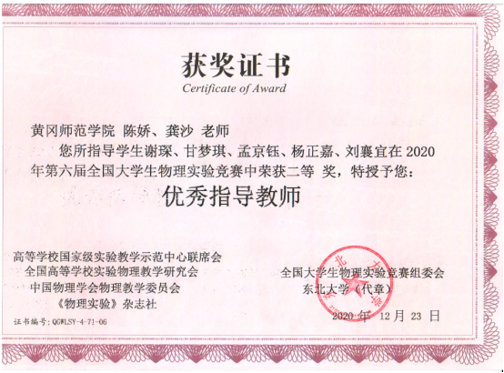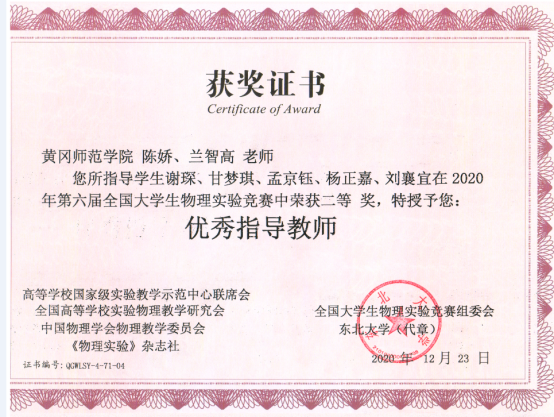 welcome888集团电子高度重视大学物理实验竞赛工作,按照师范专业认证对学生教学技能的具体要求,强化大学生技能训练组织领导,学院成立了专班,组织了一、二、三级25名同学参与的跨年级5支竞赛团队,每队学生在2名教师的指导下,进行了为期2个多月的强化训练,按照组委会的技术标准,提交了视频文件和参与线上答辩。最终,谢琛、童钊、徐健、李中豪等为代表的四支参赛队伍获得二等奖;杨昌权、王小兰、兰智高、陈娇、龚沙、刘华忠等六位教师被评为本次竞赛的优秀指导教师;学校被评为优秀组织单位。