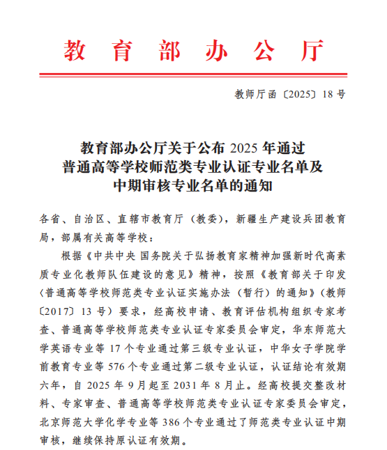 近日,教育部办公厅发布《关于公布2025年通过普通高等学校师范类专业认证专业名单及中期审核专业名单的通知》(教师厅函〔2025〕18 号),我集团物理学专业顺利通过了中学教育第二级专业认证,认证有效期六年。